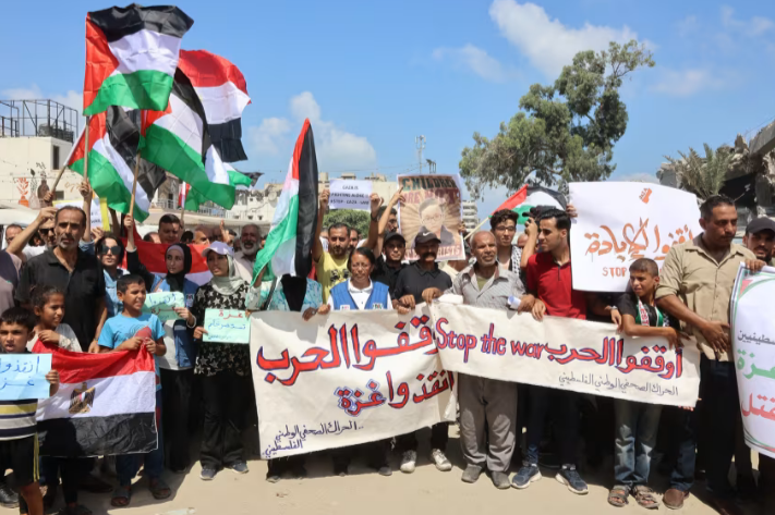Fearing further displacement and escalating bombardment, men, women and children took to the streets, waving Palestinian flags and carrying signs reading, “Stop the genocide” and “Gaza is dying.”